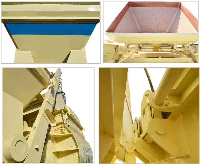 ●制動電動機經(jīng)減速器帶動卷筒轉動,鋼絲繩經(jīng)滑輪牽引料斗沿上料架軌道爬升,當爬升至預設高度時,料斗底部斗門上的一對滾輪進入上料架水軌道,斗門自動打開,物料經(jīng)過進料嘴投入攪拌筒內(nèi)。